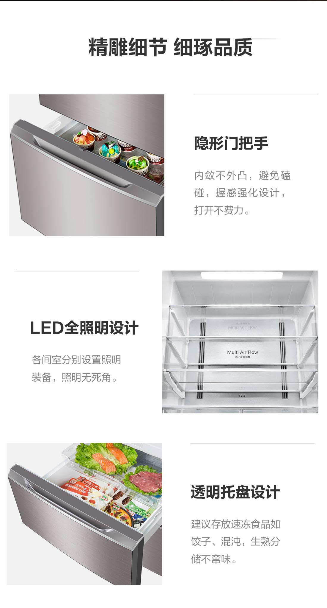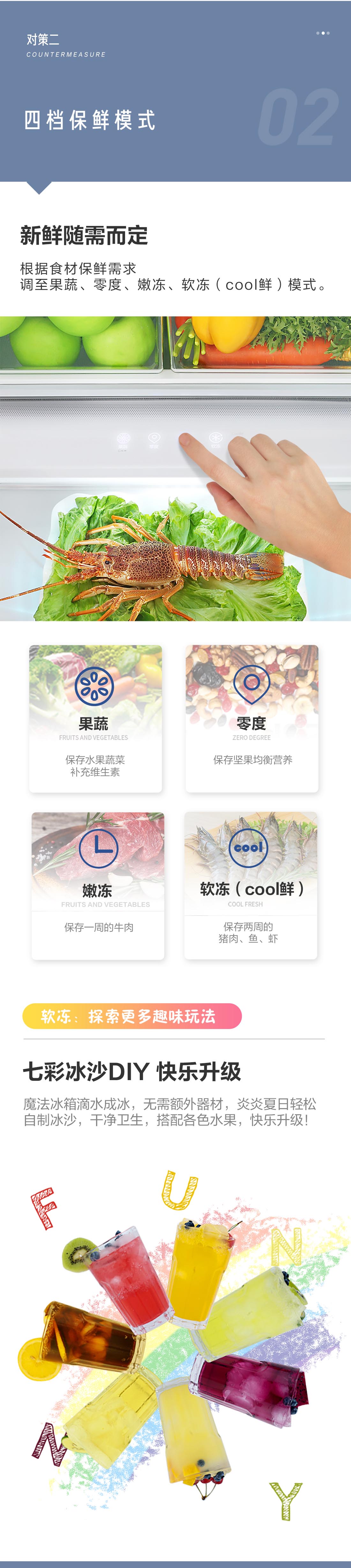 搭載-5℃瞬凍黑科技,鮮嫩兩星期,輕松一刀切。細(xì)胞級(jí)養(yǎng)鮮,營養(yǎng)流失少。搭載-3℃嫩凍黑科技,食材不結(jié)冰,鮮嫩一整周。智能全變頻技術(shù),恒溫保鮮,節(jié)能靜音。